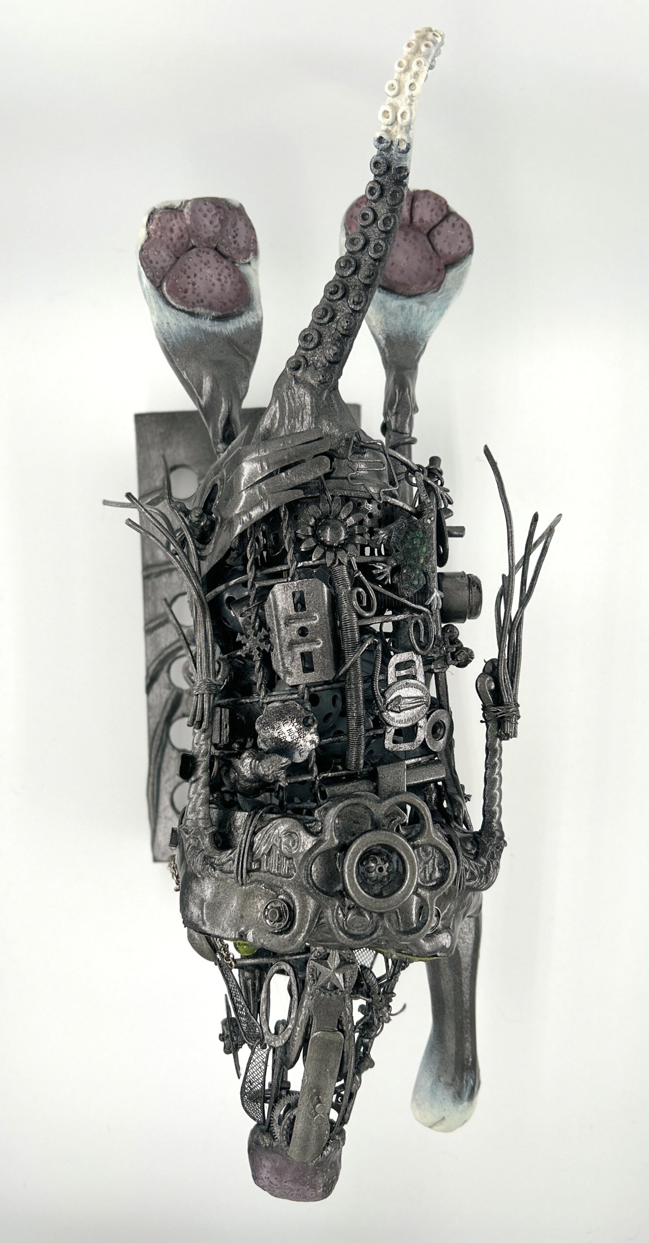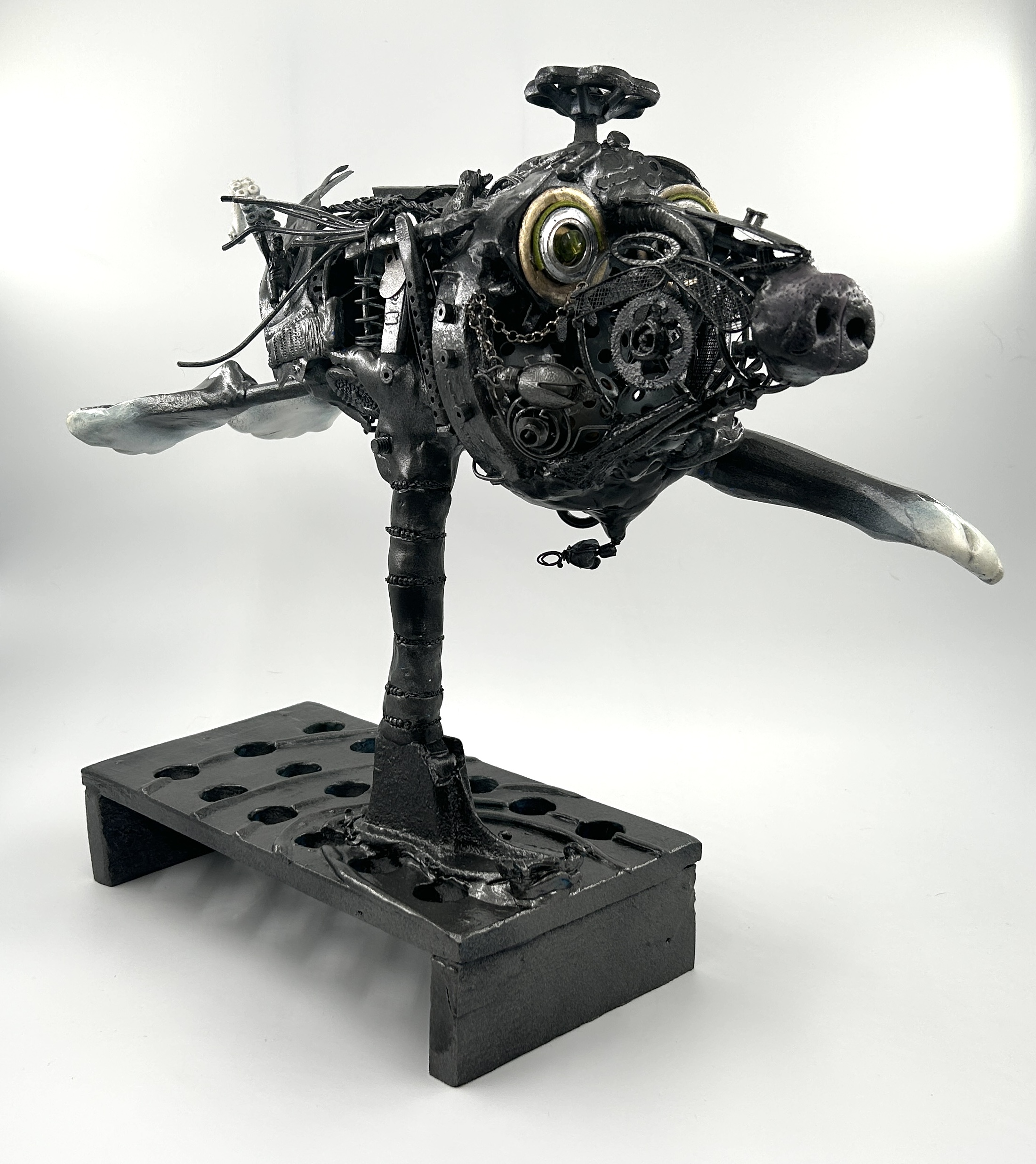 Years in the making, this dog sculpture celebrates the spirit of running full speed ahead with abandon. Composed of over 100 recycled items—along with wire, paint, epoxy sculpt, and wood—it’s a treasure hunt from every angle. Brought to life one piece at a time, this pup is finally ready for the reveal.