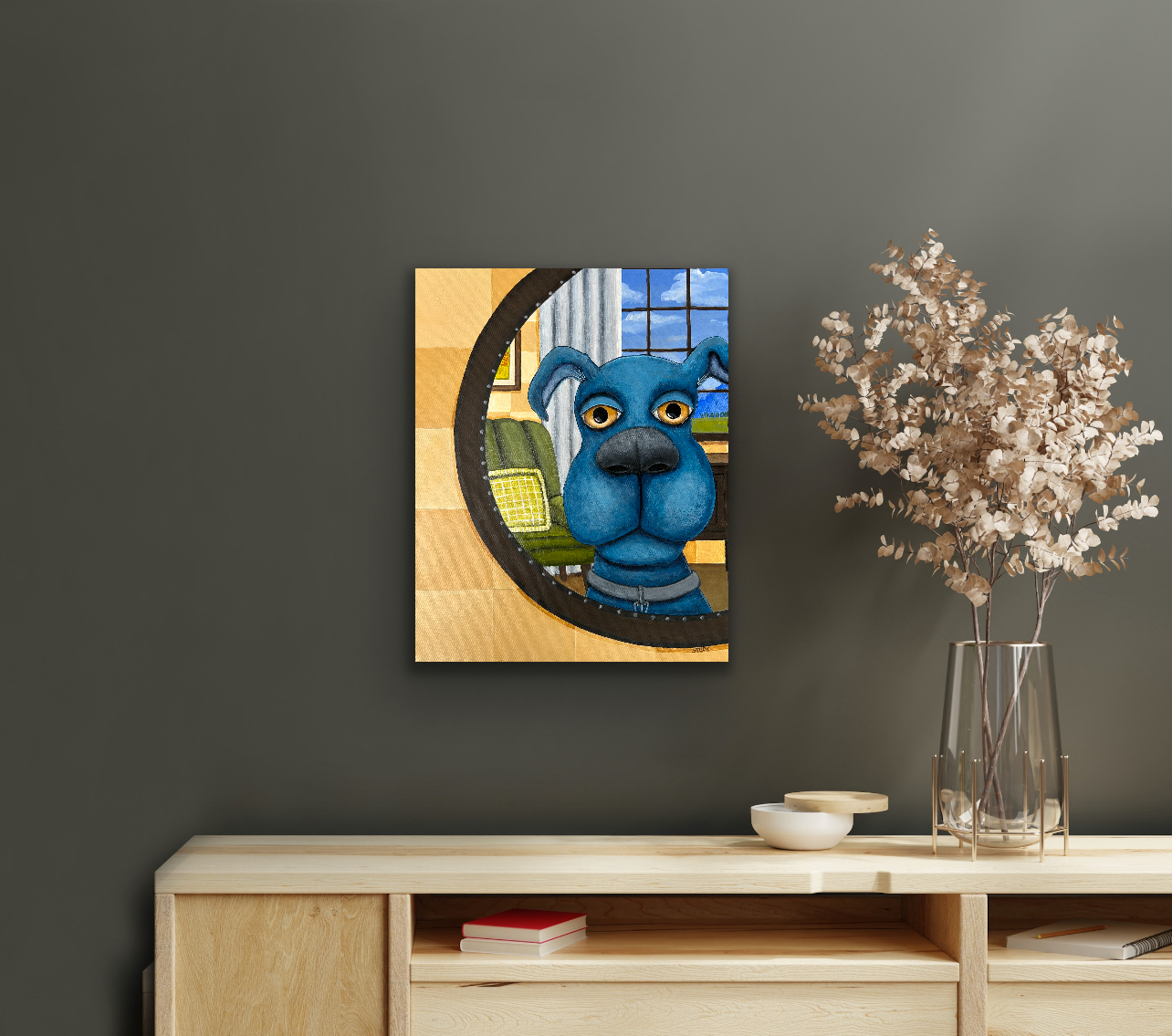 This painting was inspired by my sculpture Up Close and Personal. It’s the same dog, just from the opposite perspective—which I found really fun and intriguing. It tells even more of the story: one about the small, funny, honest moments that make life with a dog (and a mirror) so memorable.