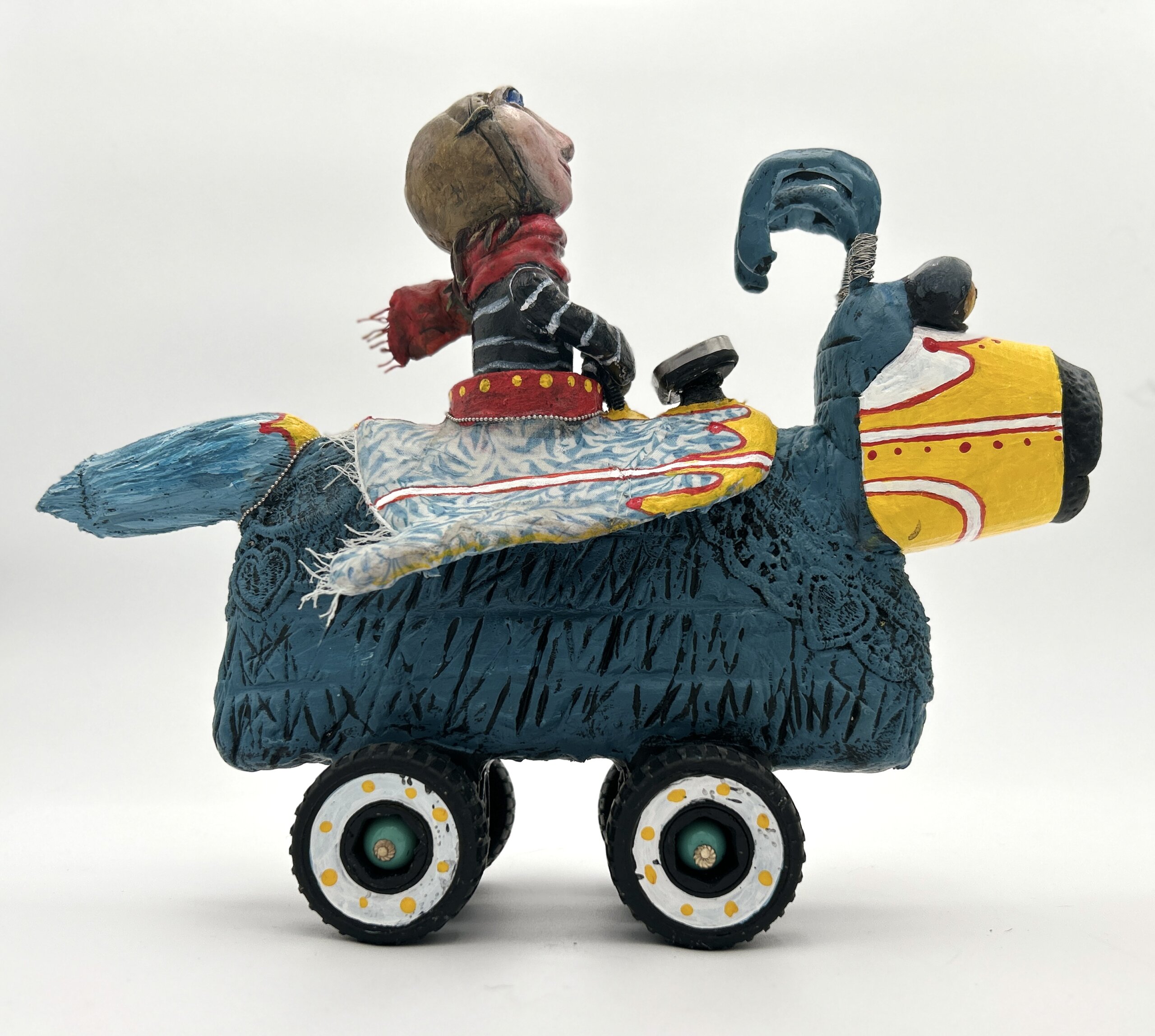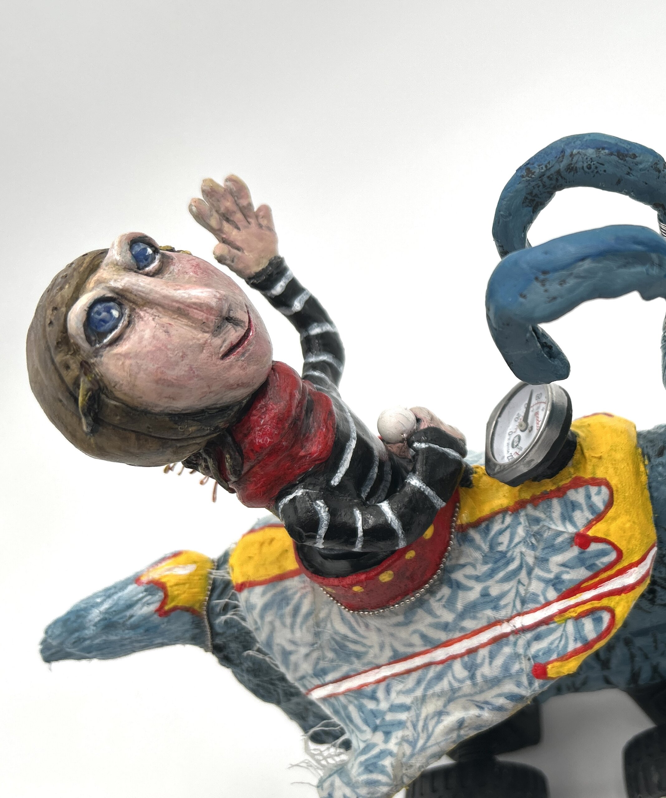 Built from a playful mix of recycled children’s plastic toys, wood, curtain clips, beads, wire, and epoxy sculpt, this colorful sculpture is rich with texture and personality. A repurposed meat thermometer serves as the instrument panel — and even provides an approximate read of the room temperature!